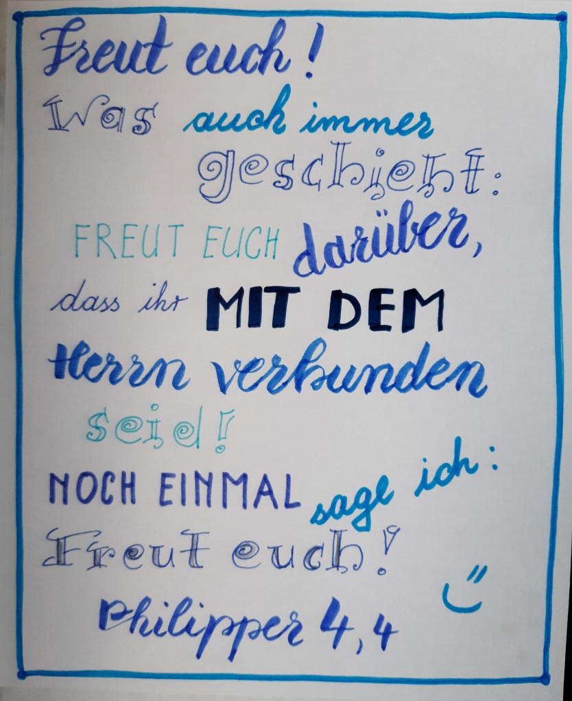 Kann man das auf Befehl tun? Sich freuen? Paulus hält das offensichtlich für möglich. Er saß im Gefängnis und hatte äußerlich wenig Grund, sich zu freuen. Sicher hatte er viel Zeit zum Nachdenken. Vielleicht so wie wir momentan, wenn viele unserer kleinen Alltagsfreuden wegfallen. Echte Freude hat einen viel tieferen Grund. Wir dürfen uns darüber freuen, dass wir mit dem Herrn Jesus verbunden sind. Mir ist in den vergangenen Monaten die Freude an meiner Beziehung mit Gott viel wichtiger geworden. Das Leben hier dauert nur einen kurzen Moment, dann sind wir in der Ewigkeit mit unserem Herrn verbunden. Dort wird kein Leid und keine Not mehr sein, kein Geschrei über Unrecht, weil er das ewige Recht aufrichten wird. Der Sonntag gibt uns einen kleinen Vorgeschmack: Freu dich heute über die Zeit, die du mit Gott verbringen kannst!