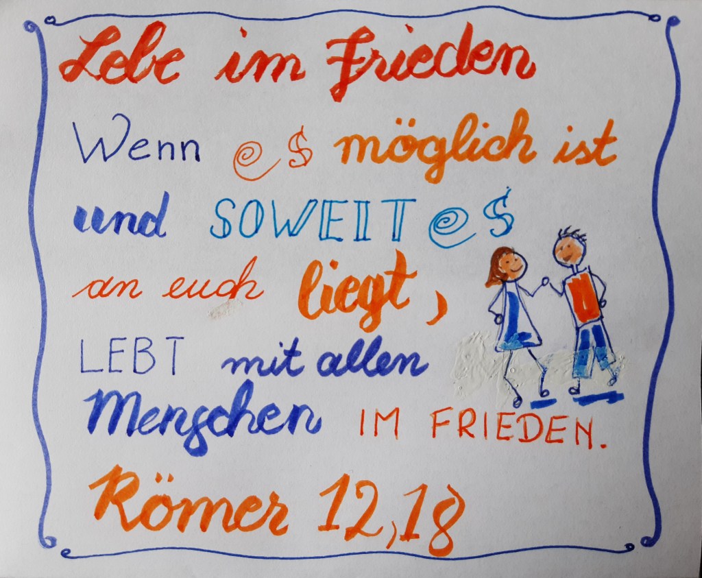 Im Frieden zu leben ist manchmal gar nicht so einfach. So Vieles will uns den Frieden rauben. Äußere und innere Fragen und Nöte beunruhigen uns, vielleicht Meinungsverschiedenheiten über politische oder gesellschaftliche Fragen. Heute geht es darum, mit anderen Menschen in Frieden zu leben, grundsätzlich die Entscheidung zu treffen, anderen gegenüber im Frieden zu sein. Ein freundliches Wort, ein netter Blick, eine Entschuldigung oder eine kurze Botschaft kann eine gute Beziehung aufrechterhalten oder wiederherstellen. Gibt es jemanden, mit dem du im Unfrieden bist? Suche einen Weg zur Versöhnung, wenn irgend möglich! Lass nicht zu, dass deine Beziehungen zerstört werden! Aber das Wichtigste ist, dass du mit Gott im Frieden bist und bleibst.