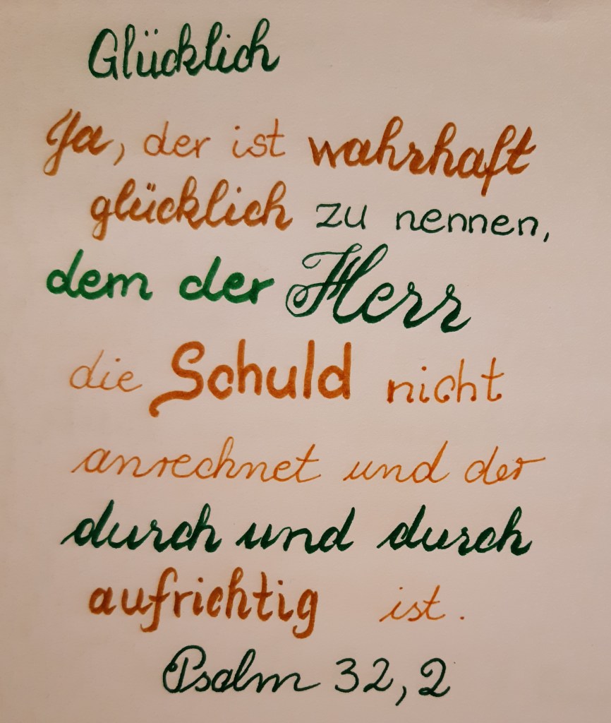 Wer möchte nicht glücklich sein? Oft schauen wir auf kleine Freuden, sehnen das Wochenende herbei oder sonniges Wetter. Aber dieses Glück dauert oft nicht lange an und wird leicht getrübt. So ein dauerhaftes Glück, das nicht vergänglich ist, wäre toll! Vergebene Schuld und Aufrichtigkeit scheinen wichtige Voraussetzungen für Glück zu sein. Alleine können wir uns keine Schuld vergeben, dazu brauchen wir Gottes Gnade. Aber wo wir aufrichtig unsere Schuld bekennen und ihn um Vergebung bitten, da rechnet er unsere Schuld nicht an. Und wenn wir dies glauben, können wir dauerhaft glücklich sein. Und daneben die kleinen Freuden des Alltags auch besser genießen. Achte mal darauf, welche Kleinigkeiten dich glücklich machen!