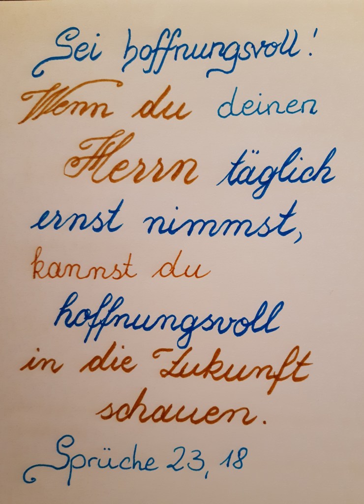 Ein interessanter Vers! Gott täglich ernst nehmen? Was heißt denn das? Ich bete doch und lese die Bibel – oder vielleicht mache ich es auch nicht (mehr), weil ich enttäuscht bin von meinem Leben und damit auch von Gott. „Ihn ernst nehmen“ hat auch viel damit zu tun, dass ich seine Zusagen lese und vertraue, dass er wirklich immer bei mir ist – in jeder noch so bescheuerten Lage. Und ehrlich: Manchmal fällt mir das auch nicht so leicht, wenn mal wieder alle meine Pläne, Wünche und Vorstellungen nicht klappen. Aber trotzdem ringe ich mich immer wieder dazu durch, dass das wahr ist, was er verspricht und ich ihm vertrauen kann, dass sein Plan irgendwie besser ist als meiner. Daher will ich trotz allem hoffnungsvoll in die Zukunft schauen, die unter seiner Herrschaft steht!