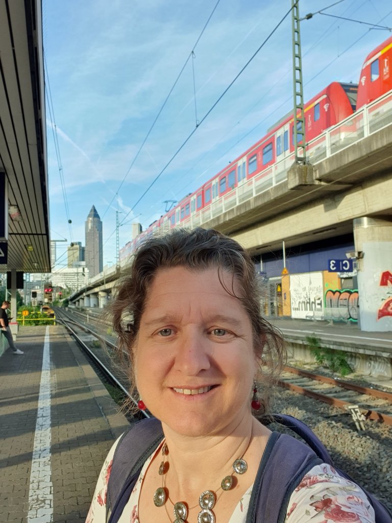 Jetzt sitze ich wieder in Frankfurt West und warte auf einen Zug, der nicht kommt – immerhin in der noch wärmenden Abendsonne. „Wir bitten um Entschuldigung“, das ist alles, was ich verstehe, denn gerade fährt ein Zug durch – leider nicht meiner. Mein nächster Zug soll eine halbe Stunde später kommen, aber auch der fällt aus.